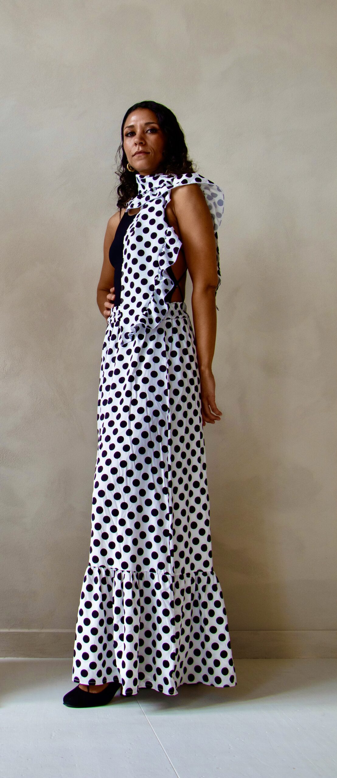 Falda de flamenca de lunares rojos sobre fondo blanco, diseñada con una silueta clásica de corte A y volante de una sola capa. Perfecto para bailar, vestir en ferias o lucirlo sin esfuerzo para looks urbanos cotidianos. Confeccionado con un tejido ligero y cómodo, presenta cinturilla ajustada y corte hasta el tobillo.